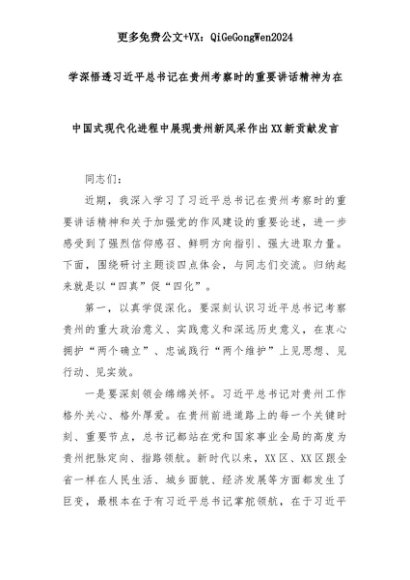 【七哥公文】2025年:学深悟透习近平总书记在贵州考察时的重要讲话精神为在中国式现代化进程中展现贵州新风采作出XX新贡献发言+更多免费公文+VX:QiGeGongWen2024+更多免费公文+VX:QiGeGongWen2024
