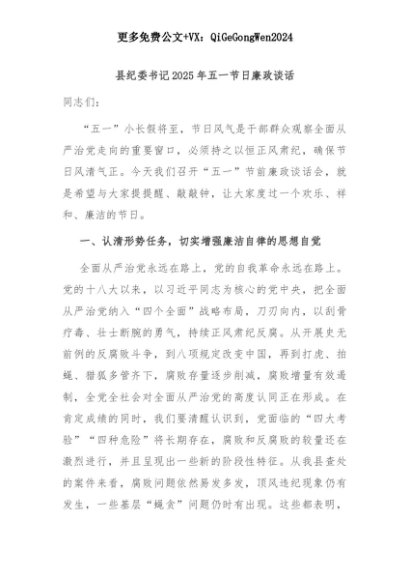 【七哥公文】2025年:县纪委书记2025年五一节日廉政谈话+更多免费公文+VX:QiGeGongWen2024+更多免费公文+VX:QiGeGongWen2024