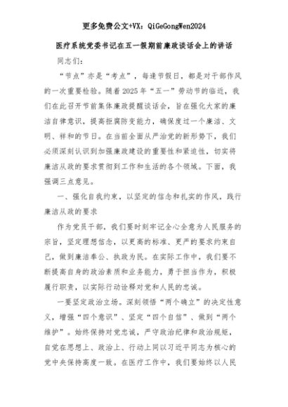 【七哥公文】2025年:医疗系统党委书记在五一假期前廉政谈话会上的讲话+更多免费公文+VX:QiGeGongWen2024+更多免费公文+VX:QiGeGongWen2024
