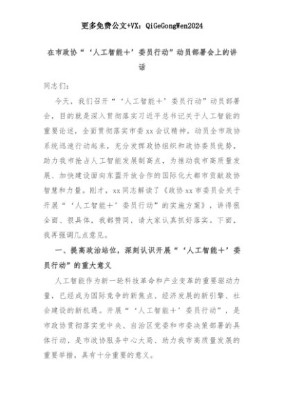 【七哥公文】2025年:在市政协“‘人工智能+’委员行动”动员部署会上的讲话+更多免费公文+VX:QiGeGongWen2024+更多免费公文+VX:QiGeGongWen2024