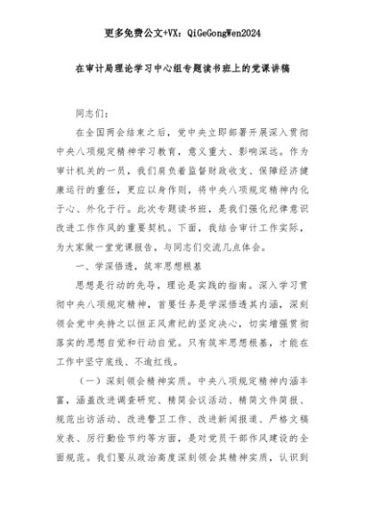 【七哥公文】2025年:在审计局理论学习中心组专题读书班上的党课讲稿+更多免费公文+VX:QiGeGongWen2024+更多免费公文+VX:QiGeGongWen2024