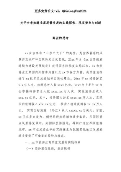 【七哥公文】2025年:关于全市旅游业高质量发展的实践探索、现实壁垒与创新路径的思考+更多免费公文+VX:QiGeGongWen2024+更多免费公文+VX:QiGeGongWen2024