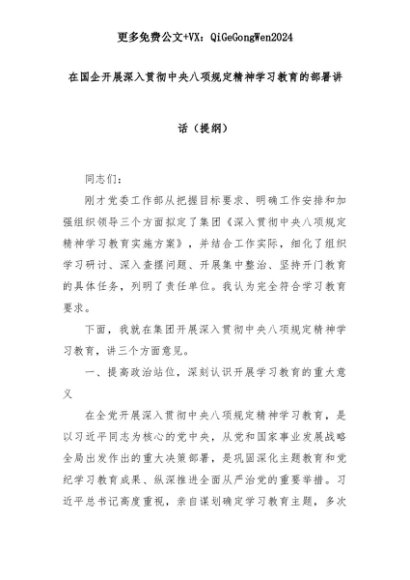【七哥公文】2025年:在国企开展深入贯彻中央八项规定精神学习教育的部署讲话(提纲)+更多免费公文+VX:QiGeGongWen2024+更多免费公文+VX:QiGeGongWen2024