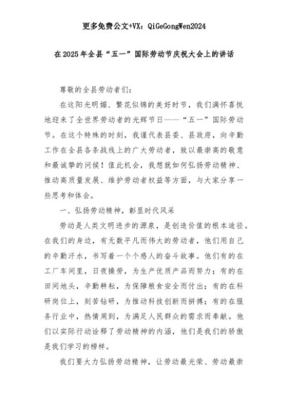【七哥公文】2025年:在2025年全县“五一”国际劳动节庆祝大会上的讲话+更多免费公文+VX:QiGeGongWen2024+更多免费公文+VX:QiGeGongWen2024