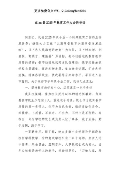 【七哥公文】2025年:在xx县2025年教育工作大会的讲话+更多免费公文+VX:QiGeGongWen2024+更多免费公文+VX:QiGeGongWen2024