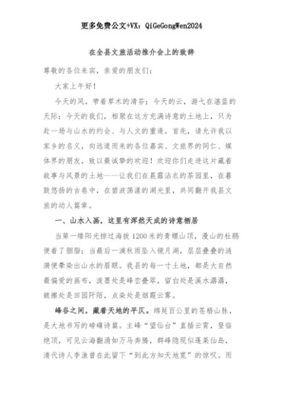 【七哥公文】2025年:在全县文旅活动推介会上的致辞+更多免费公文+VX:QiGeGongWen2024+更多免费公文+VX:QiGeGongWen2024