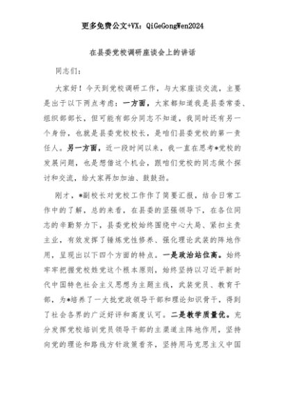 【七哥公文】2025年:在县委党校调研座谈会上的讲话+更多免费公文+VX:QiGeGongWen2024+更多免费公文+VX:QiGeGongWen2024