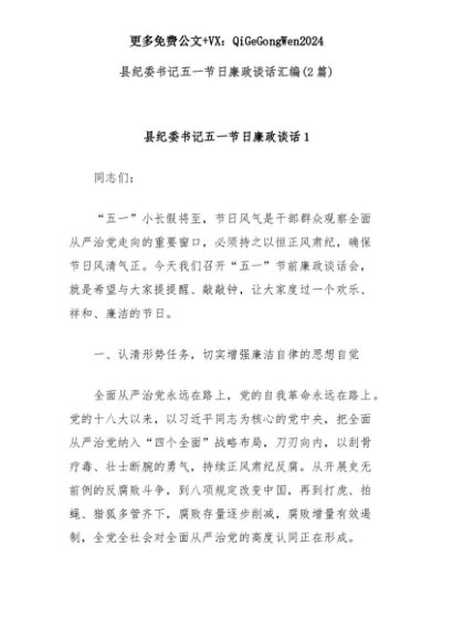 【七哥公文】2025年:(2篇)县纪委书记五一节日廉政谈话汇编+更多免费公文+VX:QiGeGongWen2024+更多免费公文+VX:QiGeGongWen2024