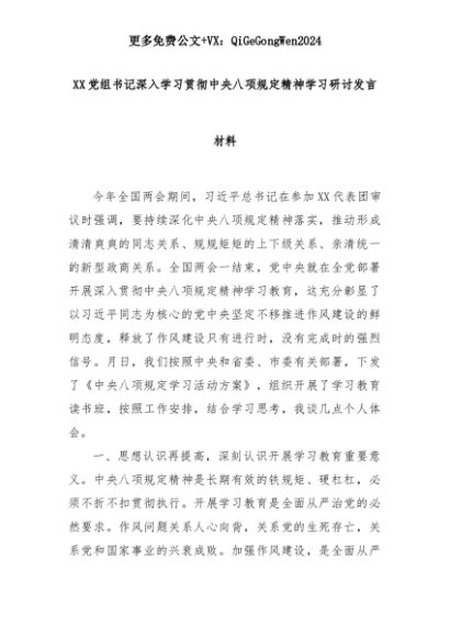 【七哥公文】2025年:XX党组书记深入学习贯彻中央八项规定精神学习研讨发言材料+更多免费公文+VX:QiGeGongWen2024+更多免费公文+VX:QiGeGongWen2024