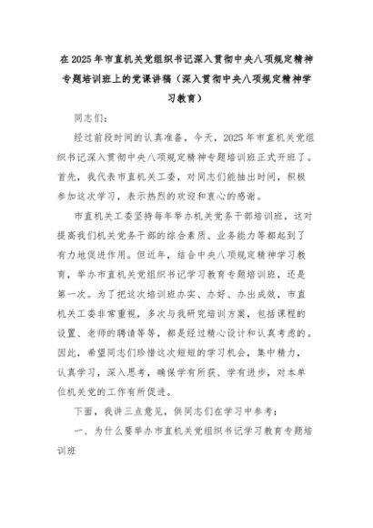 【七哥公文】2025年:在2025年市直机关党组织书记深入贯彻中央八项规定精神专题培训班上的党课讲稿(深入贯彻中央八项规定精神学习教育)+更多免费公文+VX:QiGeGongWen2024