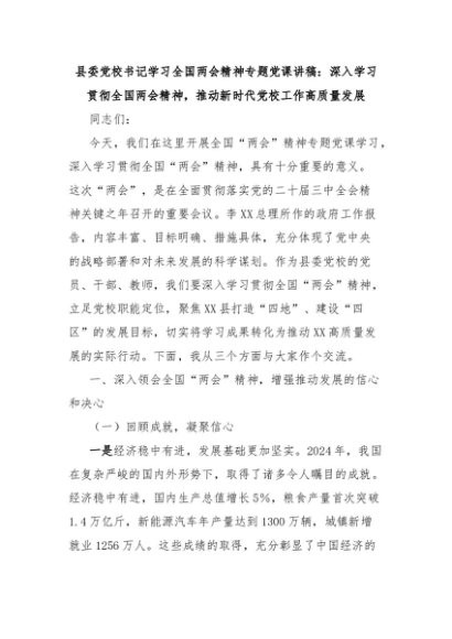 【七哥公文】2025年:县委党校书记学习全国两会精神专题党课讲稿:深入学习贯彻全国两会精神,推动新时代党校工作高质量发展+更多免费公文+VX:QiGeGongWen2024