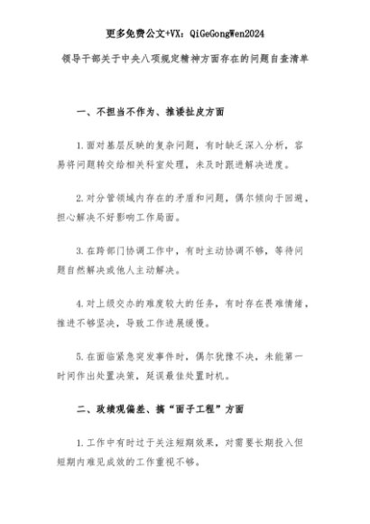 【七哥公文】2025年:领导干部关于中央八项规定精神方面存在的问题自查清单+更多免费公文+VX:QiGeGongWen2024+更多免费公文+VX:QiGeGongWen2024