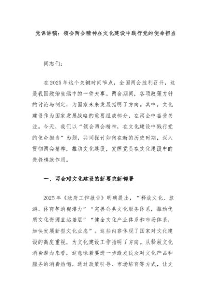 【七哥公文】2025年:党课讲稿:领会两会精神在文化建设中践行党的使命担当+更多免费公文+VX:QiGeGongWen2024