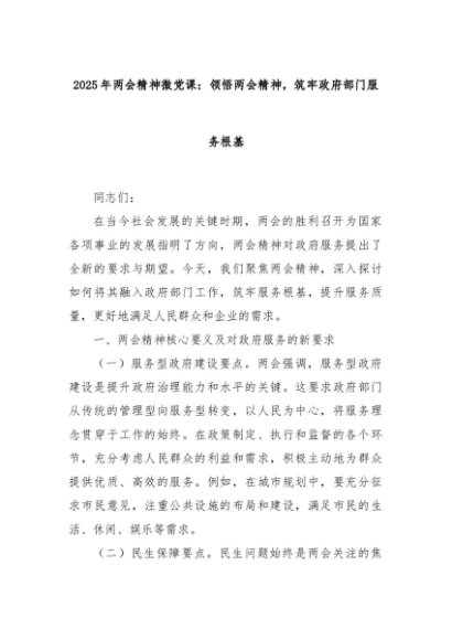 【七哥公文】2025年:2025年两会精神微党课:领悟两会精神,筑牢政府部门服务根基+更多免费公文+VX:QiGeGongWen2024