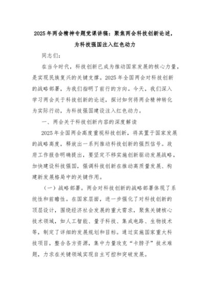 【七哥公文】2025年:2025年两会精神专题党课讲稿:聚焦两会科技创新论述,为科技强国注入红色动力+更多免费公文+VX:QiGeGongWen2024