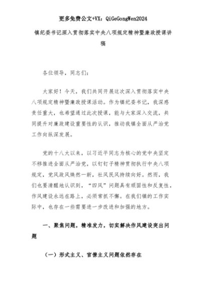 【七哥公文】2025年:镇纪委书记深入贯彻落实中央八项规定精神暨廉政授课讲稿+更多免费公文+VX:QiGeGongWen2024+更多免费公文+VX:QiGeGongWen2024
