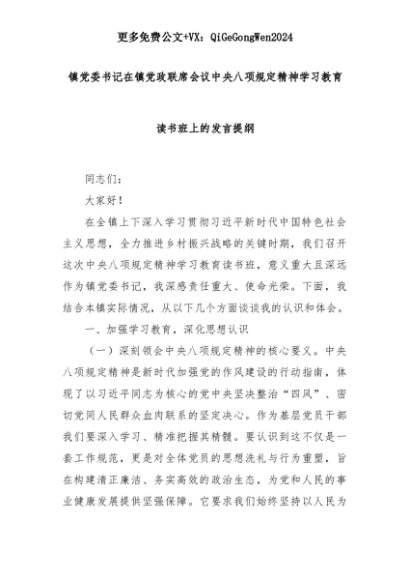 【七哥公文】2025年:镇党委书记在镇党政联席会议中央八项规定精神学习教育读书班上的发言提纲+更多免费公文+VX:QiGeGongWen2024+更多免费公文+VX:QiGeGongWen2024