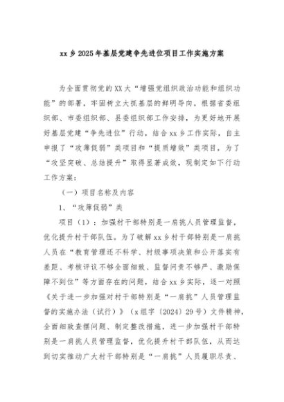 / 【七哥公文】2025年:xx乡2025年基层党建争先进位项目工作实施方案+更多免费公文+VX:QiGeGongWen2024