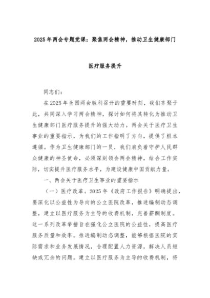 【七哥公文】2025年:2025年两会专题党课:聚焦两会精神,推动卫生健康部门医疗服务提升+更多免费公文+VX:QiGeGongWen2024