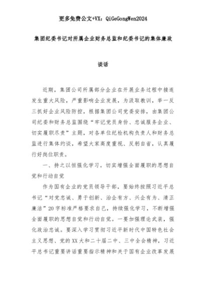【七哥公文】2025年:集团纪委书记对所属企业财务总监和纪委书记的集体廉政谈话+更多免费公文+VX:QiGeGongWen2024+更多免费公文+VX:QiGeGongWen2024