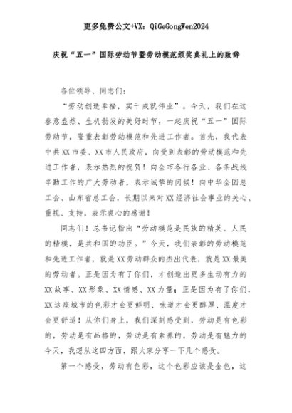【七哥公文】2025年:庆祝“五一”国际劳动节暨劳动模范颁奖典礼上的致辞+更多免费公文+VX:QiGeGongWen2024+更多免费公文+VX:QiGeGongWen2024