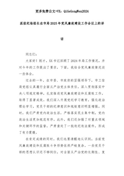 【七哥公文】2025年:派驻纪检组长在市局2025年党风廉政建设工作会议上的讲话+更多免费公文+VX:QiGeGongWen2024+更多免费公文+VX:QiGeGongWen2024