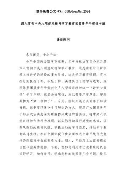 【七哥公文】2025年:深入贯彻中央八项规定精神学习教育团员青年干部读书班讲话提纲+更多免费公文+VX:QiGeGongWen2024+更多免费公文+VX:QiGeGongWen2024