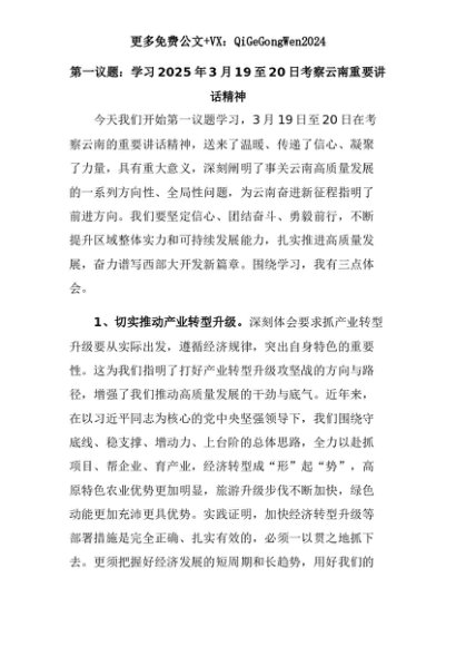 【七哥公文】2025年:第一议题:学习2025年3月19至20日考察云南重要讲话精神+更多免费公文+VX:QiGeGongWen2024+更多免费公文+VX:QiGeGongWen2024