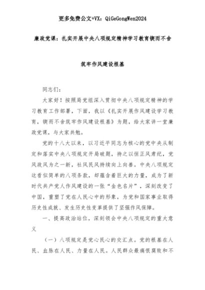 【七哥公文】2025年:廉政党课:扎实开展中央八项规定精神学习教育锲而不舍筑牢作风建设根基+更多免费公文+VX:QiGeGongWen2024+更多免费公文+VX:QiGeGongWen2024