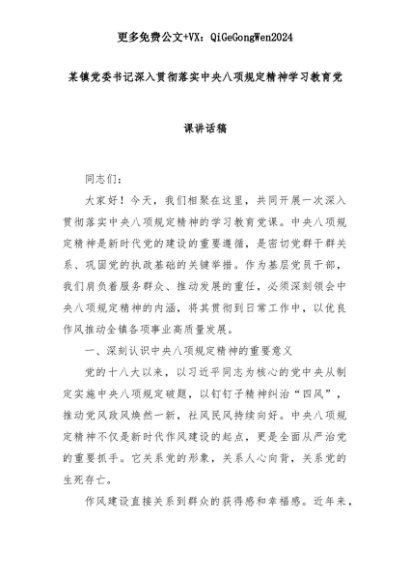 【七哥公文】2025年:某镇党委书记深入贯彻落实中央八项规定精神学习教育党课讲话稿+更多免费公文+VX:QiGeGongWen2024+更多免费公文+VX:QiGeGongWen2024