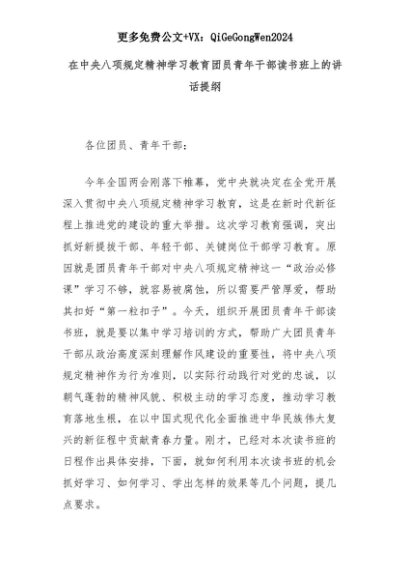 【七哥公文】2025年:在中央八项规定精神学习教育团员青年干部读书班上的讲话提纲+更多免费公文+VX:QiGeGongWen2024+更多免费公文+VX:QiGeGongWen2024