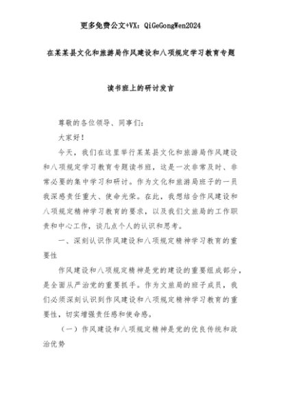 【七哥公文】2025年:在某某县文化和旅游局作风建设和八项规定学习教育专题读书班上的研讨发言+更多免费公文+VX:QiGeGongWen2024+更多免费公文+VX:QiGeGongWen2024