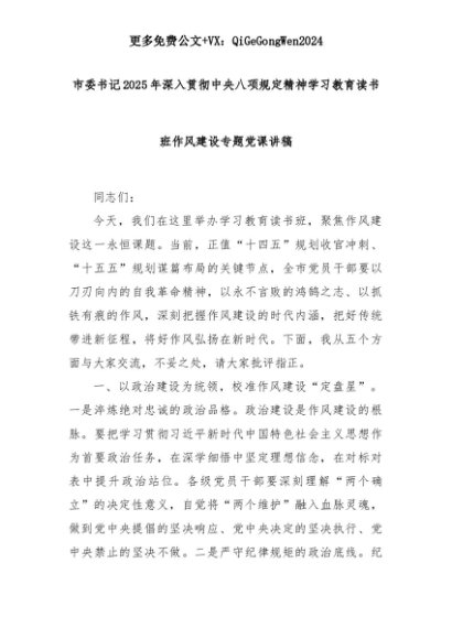 【七哥公文】2025年:市委书记2025年深入贯彻中央八项规定精神学习教育读书班作风建设专题党课讲稿+更多免费公文+VX:QiGeGongWen2024+更多免费公文+VX:QiGeGongWen2024