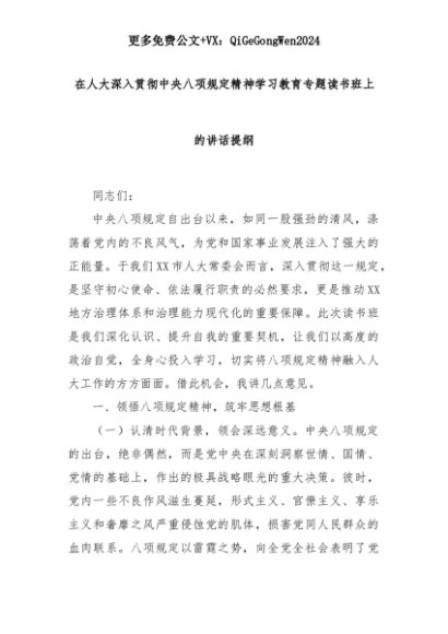 【七哥公文】2025年:在人大深入贯彻中央八项规定精神学习教育专题读书班上的讲话提纲+更多免费公文+VX:QiGeGongWen2024+更多免费公文+VX:QiGeGongWen2024