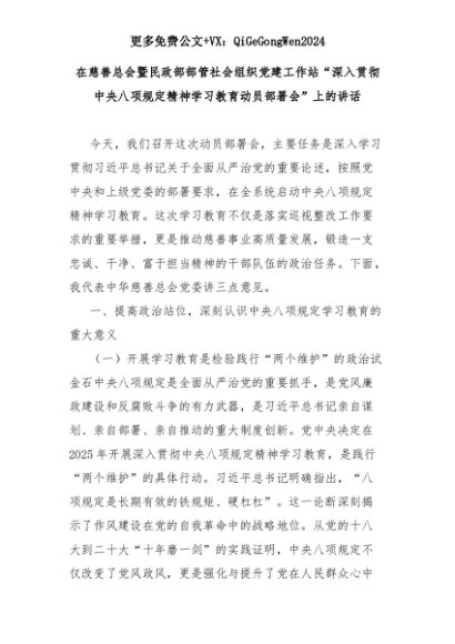 【七哥公文】2025年:在慈善总会暨民政部部管社会组织党建工作站“深入贯彻中央八项规定精神学习教育动员部署会”上的讲话+更多免费公文+VX:QiGeGongWen2024+更多免费公文+VX:QiGeGongWen2024