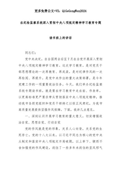【七哥公文】2025年:在纪检监察系统深入贯彻中央八项规定精神学习教育专题读书班上的讲话+更多免费公文+VX:QiGeGongWen2024+更多免费公文+VX:QiGeGongWen2024