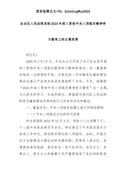 【七哥公文】2025年:在全区人民法院系统2025年深入贯彻中央八项规定精神学习教育上的主题党课+更多免费公文+VX:QiGeGongWen2024+更多免费公文+VX:QiGeGongWen2024