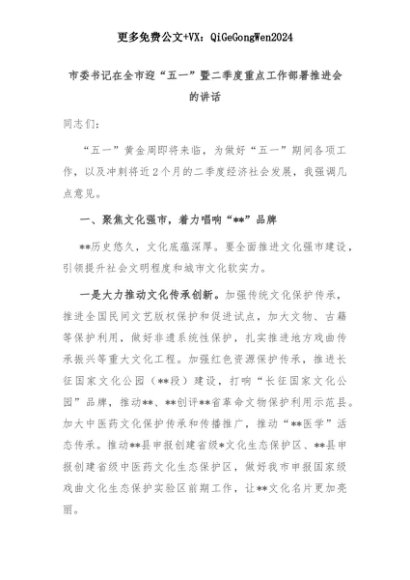 【七哥公文】2025年:市委书记在全市迎“五一”暨二季度重点工作部署推进会的讲话+更多免费公文+VX:QiGeGongWen2024+更多免费公文+VX:QiGeGongWen2024