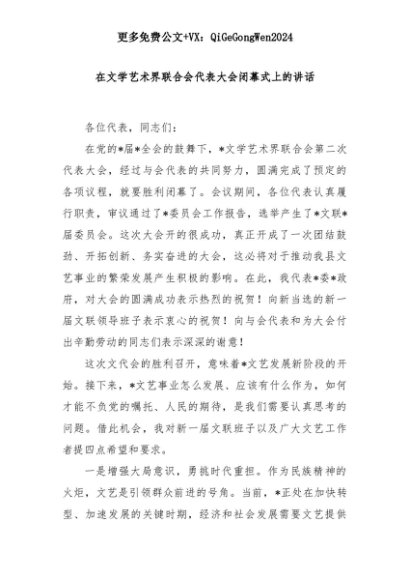 【七哥公文】2025年:在文学艺术界联合会代表大会闭幕式上的讲话+更多免费公文+VX:QiGeGongWen2024+更多免费公文+VX:QiGeGongWen2024