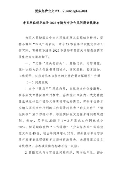 【七哥公文】2025年:市直单位领导班子2025年隐形变异作风问题查找清单+更多免费公文+VX:QiGeGongWen2024+更多免费公文+VX:QiGeGongWen2024