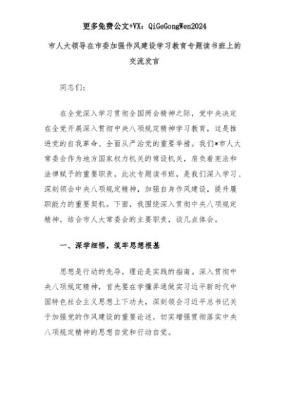 【七哥公文】2025年:市人大领导在市委加强作风建设学习教育专题读书班上的交流发言+更多免费公文+VX:QiGeGongWen2024+更多免费公文+VX:QiGeGongWen2024