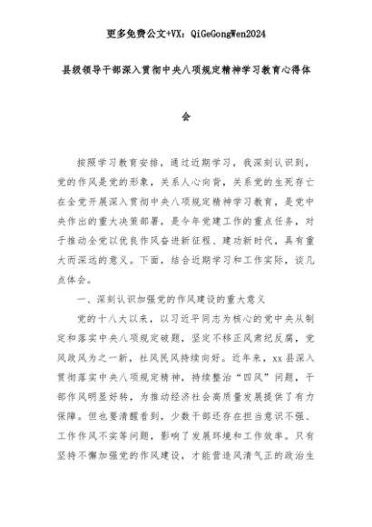 【七哥公文】2025年:县级领导干部深入贯彻中央八项规定精神学习教育心得体会+更多免费公文+VX:QiGeGongWen2024+更多免费公文+VX:QiGeGongWen2024