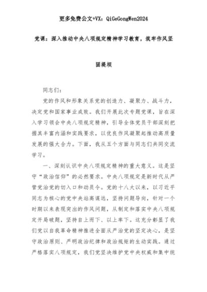 【七哥公文】2025年:党课:深入推动中央八项规定精神学习教育,筑牢作风坚固堤坝+更多免费公文+VX:QiGeGongWen2024+更多免费公文+VX:QiGeGongWen2024