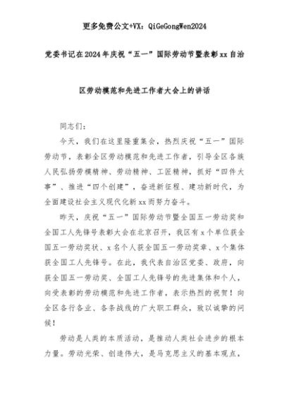 【七哥公文】2025年:党委书记在2024年庆祝“五一”国际劳动节暨表彰xx自治区劳动模范和先进工作者大会上的讲话+更多免费公文+VX:QiGeGongWen2024+更多免费公文+VX:QiGeGongWen2024