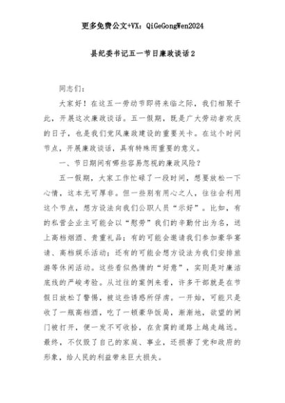 【七哥公文】2025年:县纪委书记五一节日廉政谈话2+更多免费公文+VX:QiGeGongWen2024+更多免费公文+VX:QiGeGongWen2024
