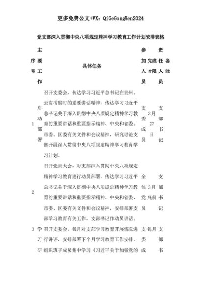 【七哥公文】2025年:党支部深入贯彻中央八项规定精神学习教育工作计划安排表格+更多免费公文+VX:QiGeGongWen2024+更多免费公文+VX:QiGeGongWen2024