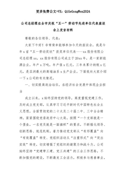 【七哥公文】2025年:公司总经理在全市庆祝“五一”劳动节先进单位代表座谈会上发言材料+更多免费公文+VX:QiGeGongWen2024+更多免费公文+VX:QiGeGongWen2024