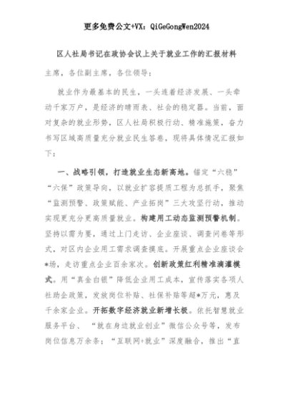 【七哥公文】2025年:区人社局书记在政协会议上关于就业工作的汇报材料+更多免费公文+VX:QiGeGongWen2024+更多免费公文+VX:QiGeGongWen2024