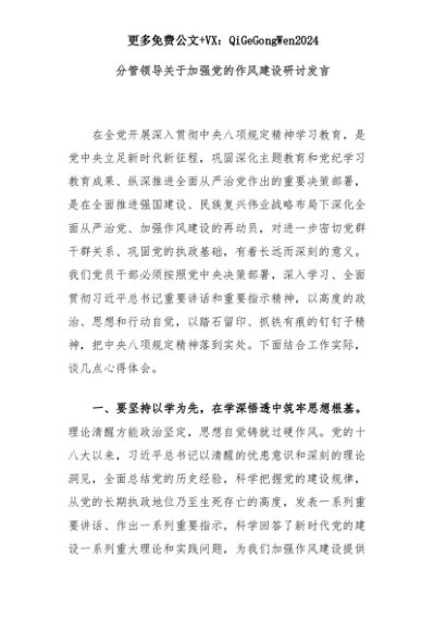 【七哥公文】2025年:分管领导关于加强党的作风建设研讨发言+更多免费公文+VX:QiGeGongWen2024+更多免费公文+VX:QiGeGongWen2024