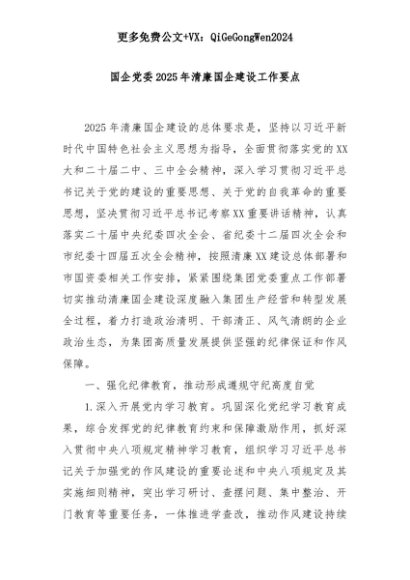 【七哥公文】2025年:国企党委2025年清廉国企建设工作要点+更多免费公文+VX:QiGeGongWen2024+更多免费公文+VX:QiGeGongWen2024